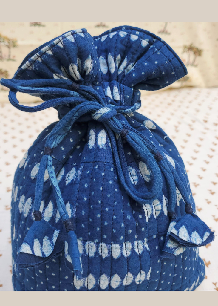 INDIGO BLOCK PRINT cotton drawstring pouch bag AVA-IND - 01